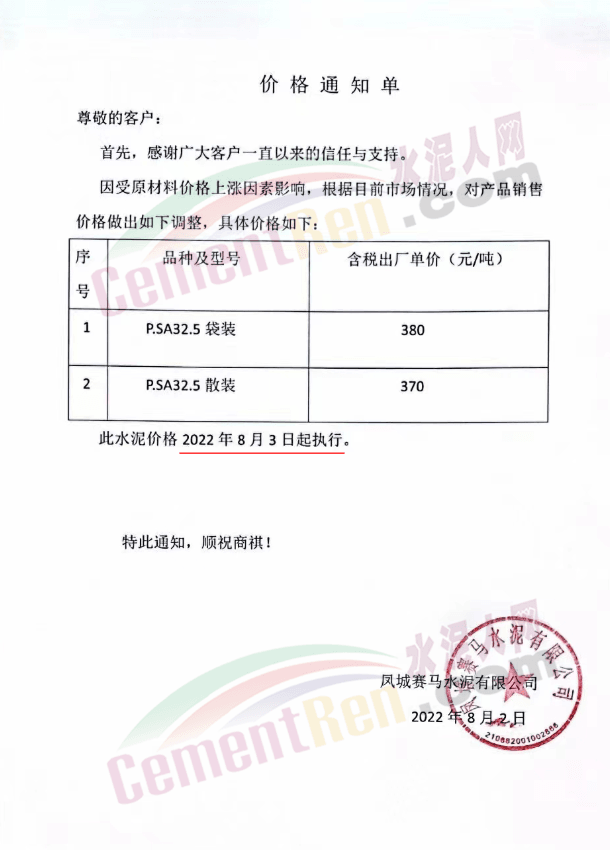 遼寧丹東鳳城賽馬水泥通知,因受原材料價(jià)格上漲因素影響,根據(jù)目前市場情況,自8月3日起對產(chǎn)品銷售價(jià)格作出調(diào)整,調(diào)整后P.S.A32.5散裝水泥報(bào)價(jià)370元/噸。