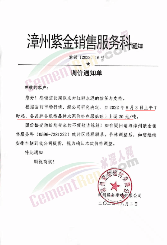 漳州紫金銷售服務(wù)科通知,根據(jù)當(dāng)前市場行情,經(jīng)公司研究決定,自8月3日上午7時起,各品牌各規(guī)格品種水泥價格在原基礎(chǔ)上上調(diào)20元/噸。價格調(diào)整后,如繼續(xù)安排車輛到公司提貨,視為確認本次價格調(diào)整。