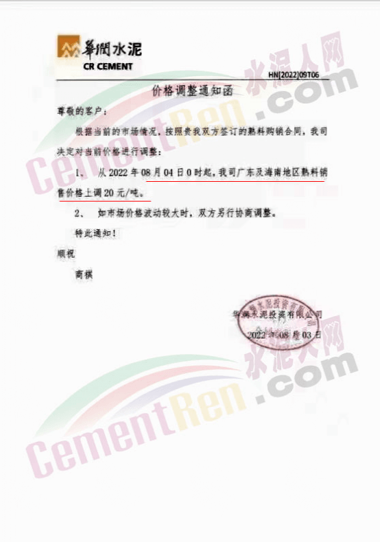 水泥人網(wǎng)通訊員消息,日前,華潤水泥投資有限公司通知,從8月4日0時起,公司廣東及海南地區(qū)熟料銷售價格上調20元/噸。潮汕及揭尾區(qū)域全品種散裝水泥,珠三角(含惠州)及粵西各區(qū)域P.C42.5散裝水泥價格同步上調20元/噸。