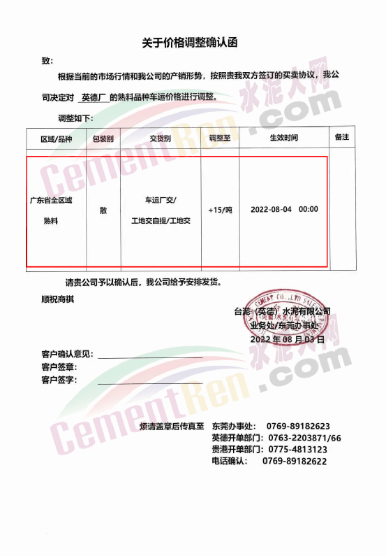 同期梅州市塔牌營有限公司通知,自8月6日零時起,福梅基地各廠所有品種等級散裝水泥出廠結算價格分別在現(xiàn)行價格基礎上上調20元/噸。