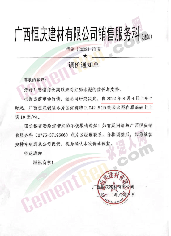 廣西恒慶建材有限公司銷售服務科通知,自8月4日上午7時起,銷往各片區(qū)紅獅牌P.O42.5(R)散裝水泥在原基礎上上調10元/噸。