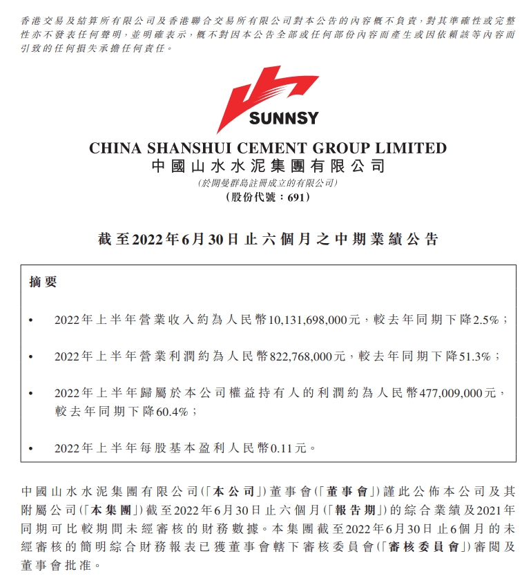 山水水泥(00691)發(fā)布2022年中期業(yè)績(jī),營(yíng)業(yè)收入約為人民幣101.32億元(單位下同),較去年同期下降2.5%;歸屬于公司權(quán)益持有人的利潤(rùn)約為4.77億元,較去年同期下降60.4%;每股基本盈利0.11元。