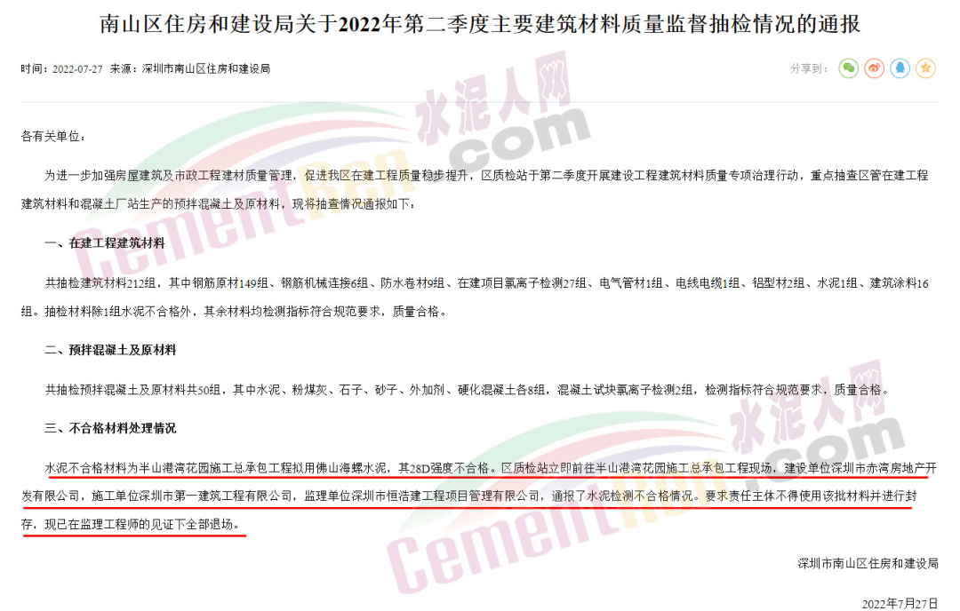 水泥不合格材料為半山港灣花園施工總承包工程擬用佛山海螺水泥,其28D強(qiáng)度不合格。區(qū)質(zhì)檢站立即前往半山港灣花園施工總承包工程現(xiàn)場(chǎng),建設(shè)單位深圳市赤灣房地產(chǎn)開發(fā)有限公司,施工單位深圳市第一建筑工程有限公司,監(jiān)理單位深圳市恒浩建工程項(xiàng)目管理有限公司,通報(bào)了水泥檢測(cè)不合格情況。要求責(zé)任主體不得使用該批材料并進(jìn)行封存,現(xiàn)已在監(jiān)理工程師的見證下全部退場(chǎng)。