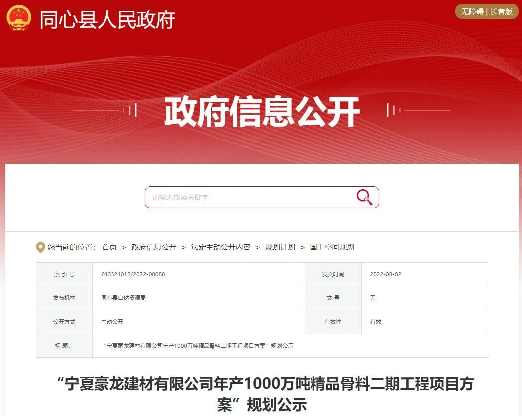 近日,同心縣自然資源局公示寧夏豪龍建材有限公司年產(chǎn)1000萬噸精品骨料二期工程項目方案規(guī)劃。