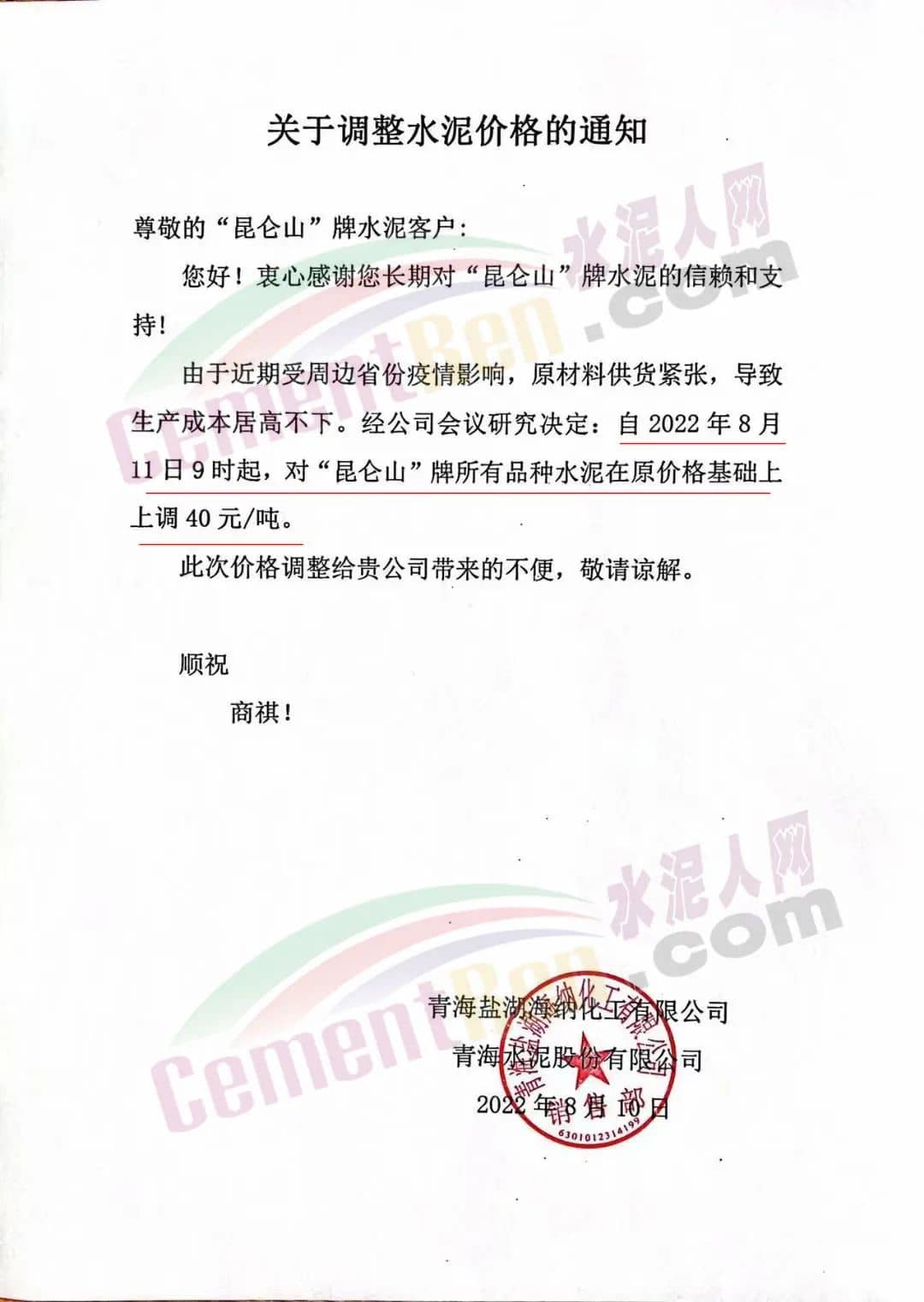 水泥人網(wǎng)通訊員消息,繼前期二十多個(gè)地區(qū)水泥價(jià)格調(diào)后,近幾日又有企業(yè)跟隨通知上調(diào)水泥價(jià)格。青海鹽湖海納化工有限公司青海水泥股份有限公司銷售部通知,由于近期受周邊省份疫情影響,原材料供貨緊張,導(dǎo)致生產(chǎn)成本居高不下,經(jīng)公司會議決定自8月11日9時(shí)起,對“昆侖山”牌所有品種水泥在原價(jià)基礎(chǔ)上上調(diào)40元/噸。