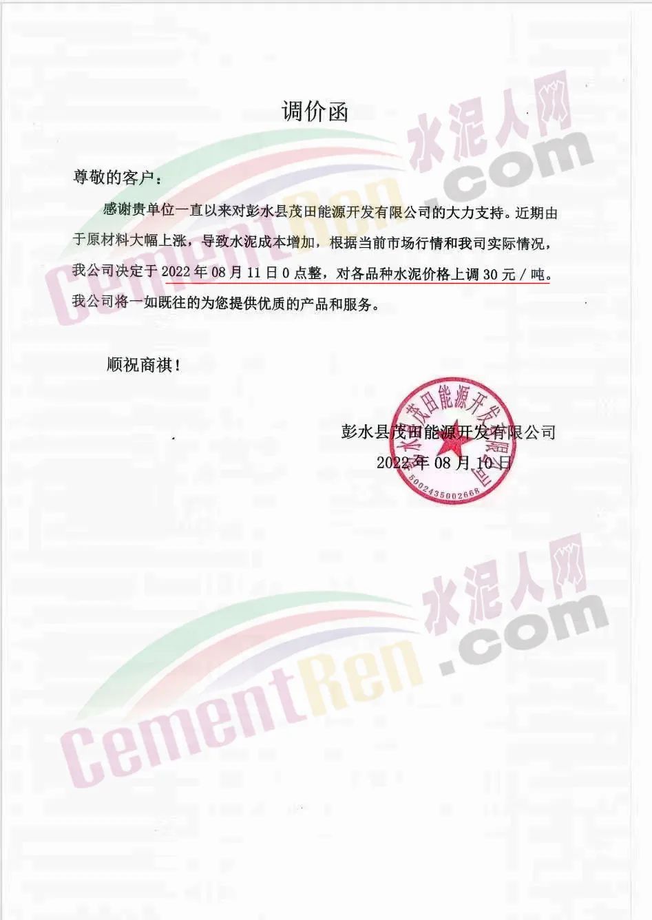 重慶彭水縣茂田能源開發(fā)有限公司調(diào)價(jià)函提到,由于原材料大幅上漲,導(dǎo)致水泥成本增加,根據(jù)當(dāng)前行情和公司實(shí)際情況,決定于8月11日0點(diǎn)整,對各品種水泥價(jià)格上調(diào)30元/噸。