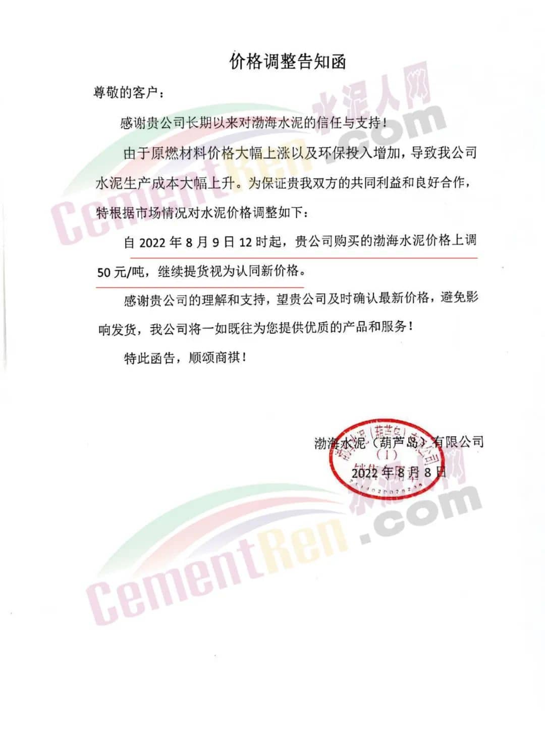 渤海水泥(葫蘆島)有限公司價(jià)格調(diào)整告知函稱,由于原燃材料價(jià)格大幅上漲以及環(huán)保投入增加,導(dǎo)致公司水泥生產(chǎn)成本大幅上升,根據(jù)市場情況自8月9日12時(shí)起,渤海水泥價(jià)格上調(diào)50元/噸,繼續(xù)提貨視為認(rèn)同新價(jià)格。