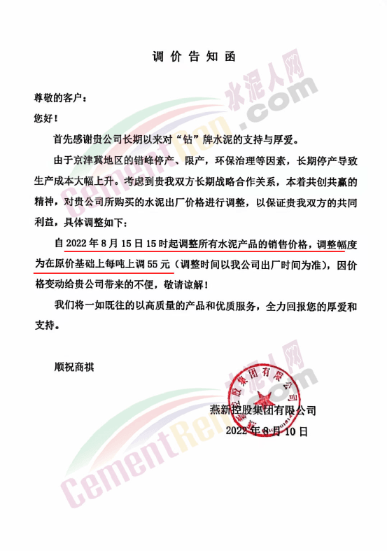燕新控股集團(tuán)有限公司通知由于京津冀地區(qū)的錯(cuò)峰停產(chǎn)、限產(chǎn),環(huán)保治理等因素,長期停產(chǎn)導(dǎo)致生產(chǎn)成本大幅上升。公司自2022年8月15日15時(shí)起所有水泥產(chǎn)品的銷售價(jià)格上調(diào)55元/噸。