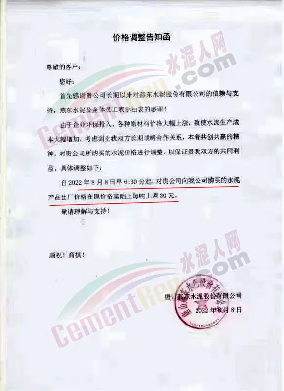 唐山冀東水泥通知,由于企業(yè)環(huán)保投入,原材料價(jià)格持續(xù)高位運(yùn)行以及長期停限產(chǎn)等因素的共同影響,致使水泥成本不斷提高。自8月15日上午8時(shí)起,公司銷往唐山、天津及秦皇島地區(qū)的水泥出廠價(jià)格在原價(jià)基礎(chǔ)上上調(diào)30元/噸。
