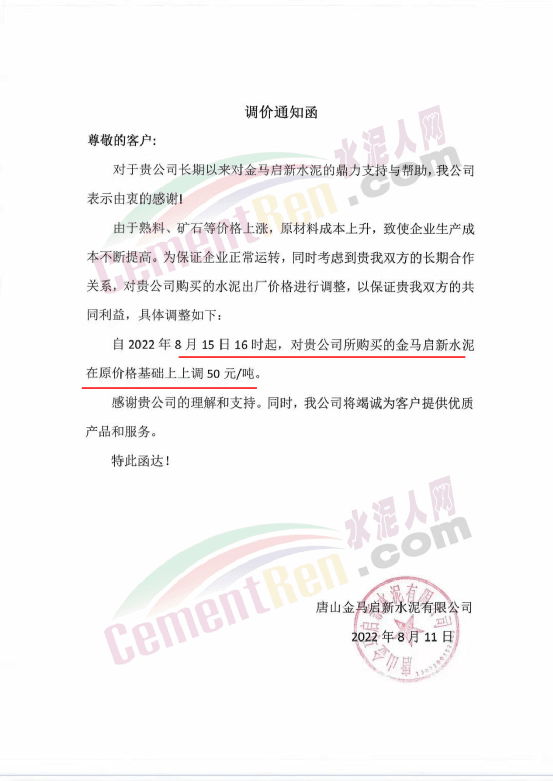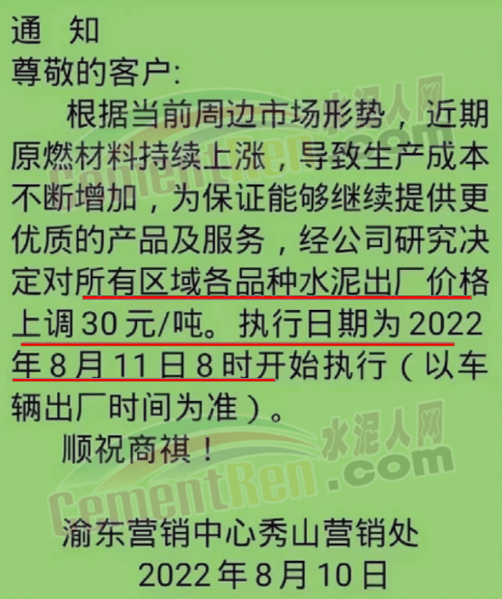 渝東營銷中心秀山營銷處通知,根據(jù)當(dāng)前周邊市場形勢,近期原燃材料持續(xù)上漲,導(dǎo)致生產(chǎn)成本不斷增加,為保證能夠繼續(xù)提供更優(yōu)質(zhì)的產(chǎn)品及服務(wù),經(jīng)公司研究決定對所有區(qū)域各品種水泥出廠價(jià)格上調(diào)30元/噸,執(zhí)行日期為2022年8月11日8時(shí)。