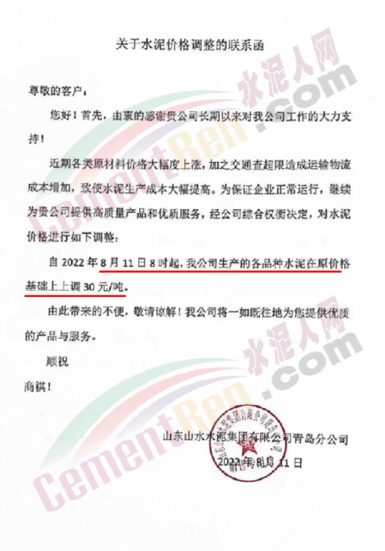 同期,山東山水水泥集團(tuán)有限公司青島分公司通知,近期各類原材料價(jià)格大幅度上漲,加之交通查超限造成運(yùn)輸物流成本增加,致使水泥生產(chǎn)成本大幅提高。經(jīng)公司綜合權(quán)衡決定,自8月11日8時(shí)起,對公司生產(chǎn)的各品種水泥在原價(jià)基礎(chǔ)上上調(diào)30元/噸。