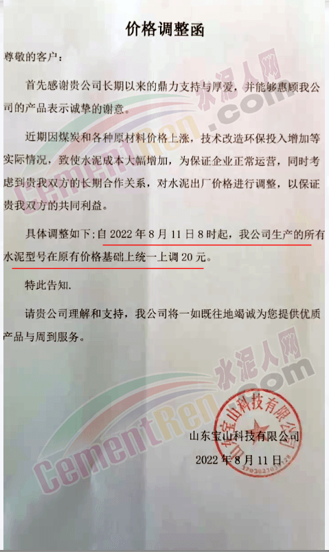 山東寶山科技有限公司通知,因煤炭和各種原材料價(jià)格上漲,技術(shù)改造環(huán)保投入增加等實(shí)際情況,致使水泥成本大幅增加,為保證企業(yè)正常運(yùn)營,自8月11日8時(shí)起,公司生產(chǎn)的所有水泥型號在原價(jià)基礎(chǔ)上統(tǒng)一上調(diào)20元/噸。