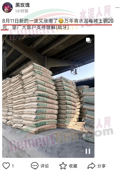 萬年青水泥通知,自8月11日起,上調(diào)20元/噸。