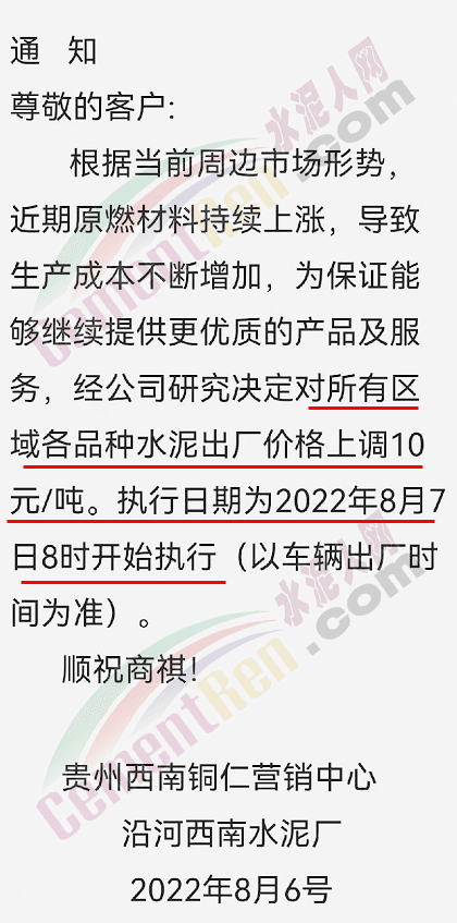 貴州西南銅仁營銷中心沿河西南水泥廠通知根據(jù)當(dāng)前周邊市場形勢,近期原燃材料持續(xù)上漲,導(dǎo)致生產(chǎn)成本不斷增加,為保證能夠繼續(xù)提供更優(yōu)質(zhì)的產(chǎn)品及服務(wù),經(jīng)公司研究決定對所有區(qū)域各品種水泥出廠價(jià)格上調(diào)10 元/噸,執(zhí)行日期為2022年8月7日8時(shí)。