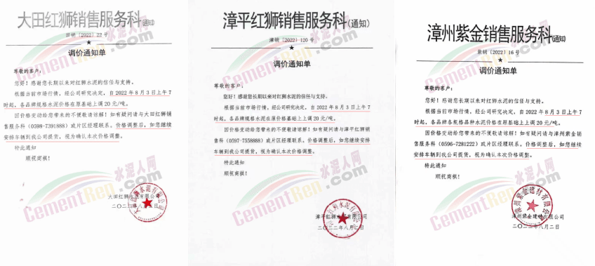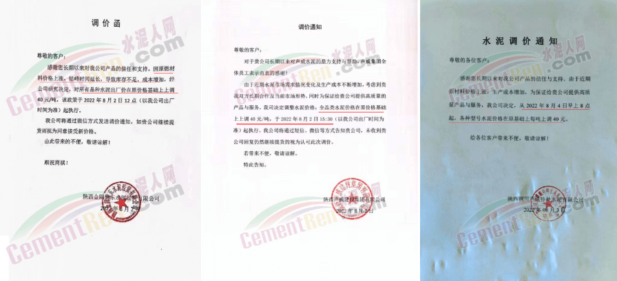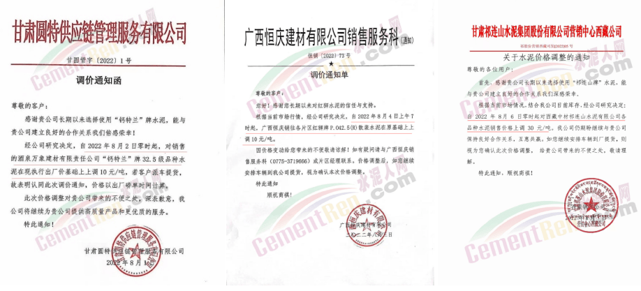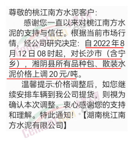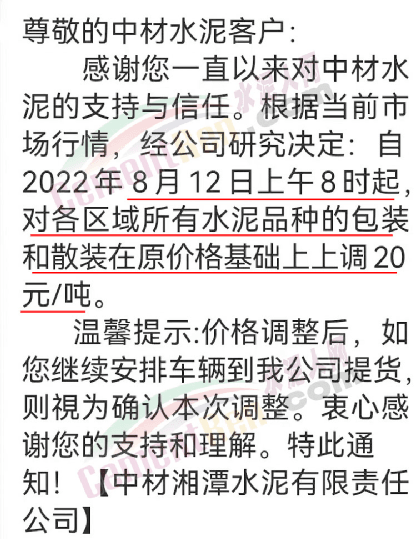 中材湘潭水泥有限責任公司通知,根據(jù)當前市場行情,經(jīng)公司研究決定自2022年8月12日上午8時起,對各區(qū)域所有水泥品種的包裝和散裝在原價格基礎上上調(diào)20元/噸。價格調(diào)整后,如繼續(xù)安排車輛到公司提貨,則視為確認本次調(diào)整。