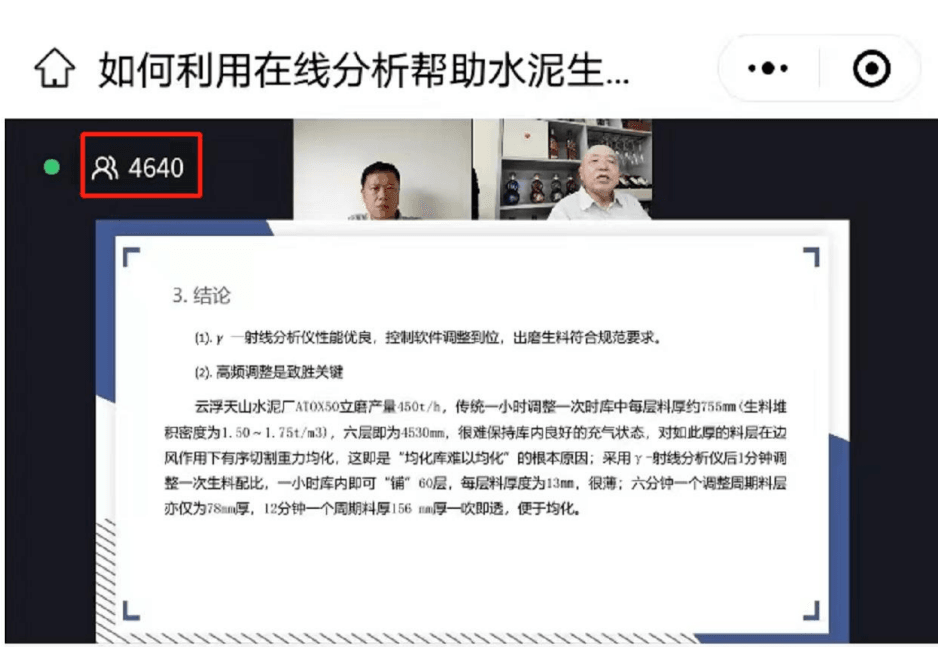 本次直播特邀賽默飛技術(shù)應(yīng)用及銷售經(jīng)理蔣山為大家?guī)?lái)賽默飛在線分析技術(shù)講解,解答水泥廠在水泥生料生產(chǎn)控制儀器中的所面臨的各類問(wèn)題。同時(shí)還邀請(qǐng)了在線分析高頻調(diào)整取代預(yù)均化堆場(chǎng)技術(shù)的主要發(fā)明者、原天津水泥工業(yè)設(shè)計(jì)研究院沈欣老師講解分析儀應(yīng)用案例及相關(guān)技術(shù)應(yīng)用。本次直播活動(dòng)累計(jì)觀看人數(shù)4375人次,進(jìn)入直播間總?cè)舜芜_(dá)4640人。