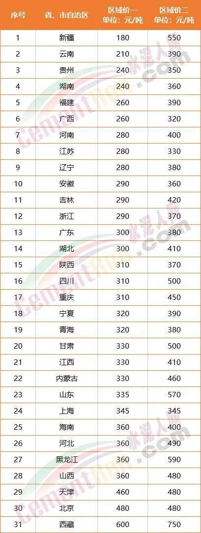 12個區(qū)域P.O42.5散裝水泥跌破300元/噸