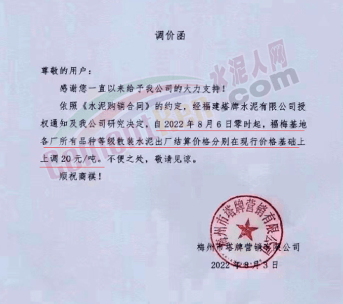 塔牌福梅基地上調(diào)水泥價(jià)格20元/噸。