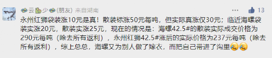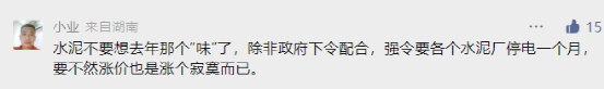 對(duì)于近期大面積的價(jià)格調(diào)漲,另一位來自于湖南區(qū)域的網(wǎng)友表示,水泥不要想去年那個(gè)“味”了,除非強(qiáng)令要各個(gè)水泥廠停電一個(gè)月,要不然漲價(jià)也是漲個(gè)寂寞而已。