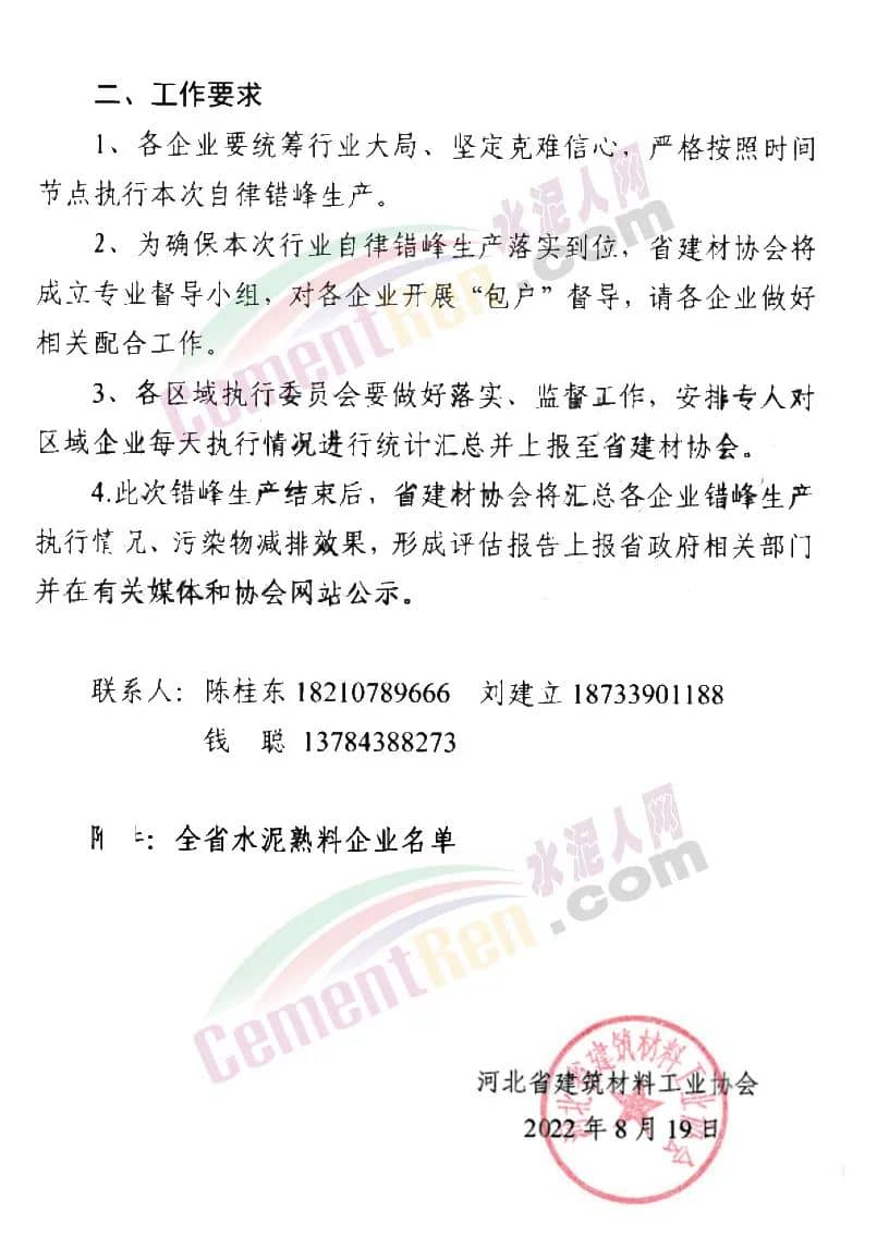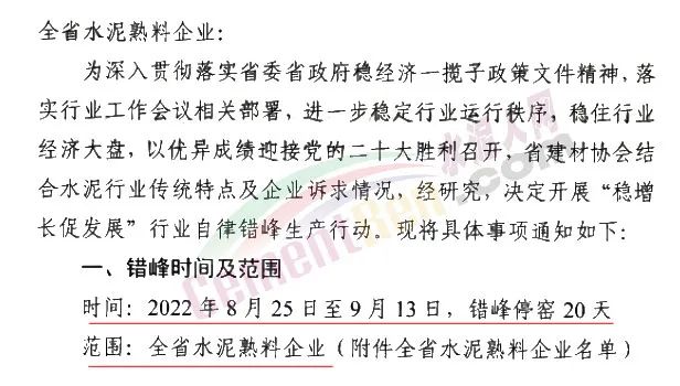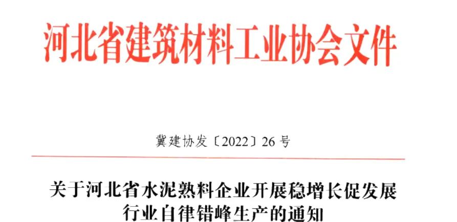 日前,河北省建筑材料工業(yè)協(xié)會(huì)發(fā)布《關(guān)于河北省水泥熟料企業(yè)開(kāi)展穩(wěn)增長(zhǎng)促發(fā)展行業(yè)自律錯(cuò)峰生產(chǎn)的通知》,是覅有河北全省水泥熟料企業(yè)自2022年8月25日~9月13日,錯(cuò)峰停窯20天。