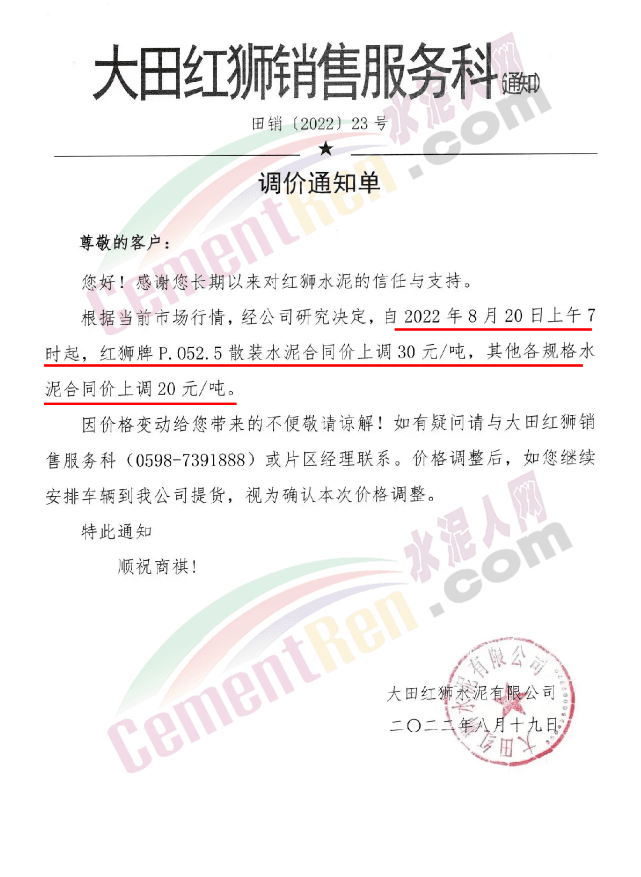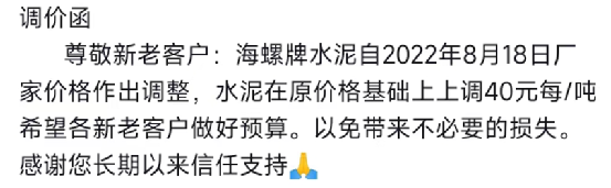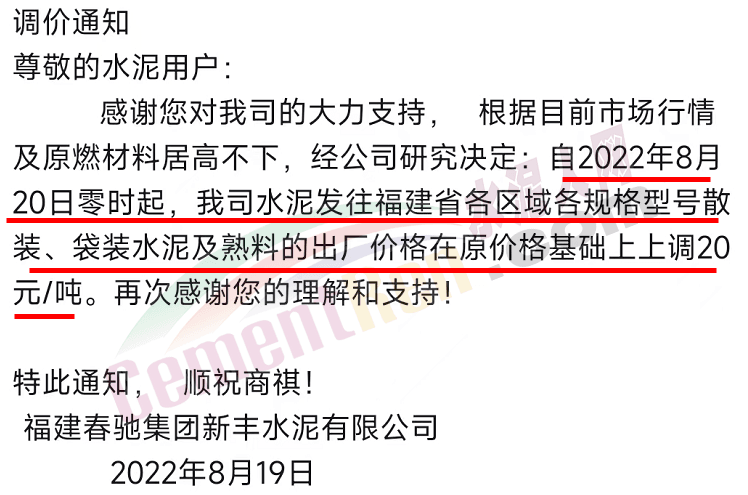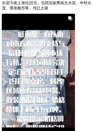 重要通知,8月19日起水泥漲價,32.5、42.5水泥全品種集體上漲。