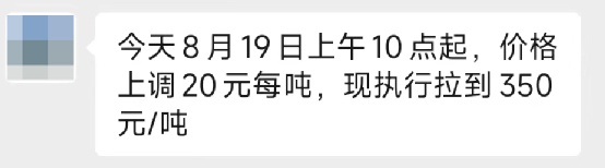 另一家河南企業(yè)通知,8月19日上午10時起,價格上調20元/噸。執(zhí)行到位價350元/噸。