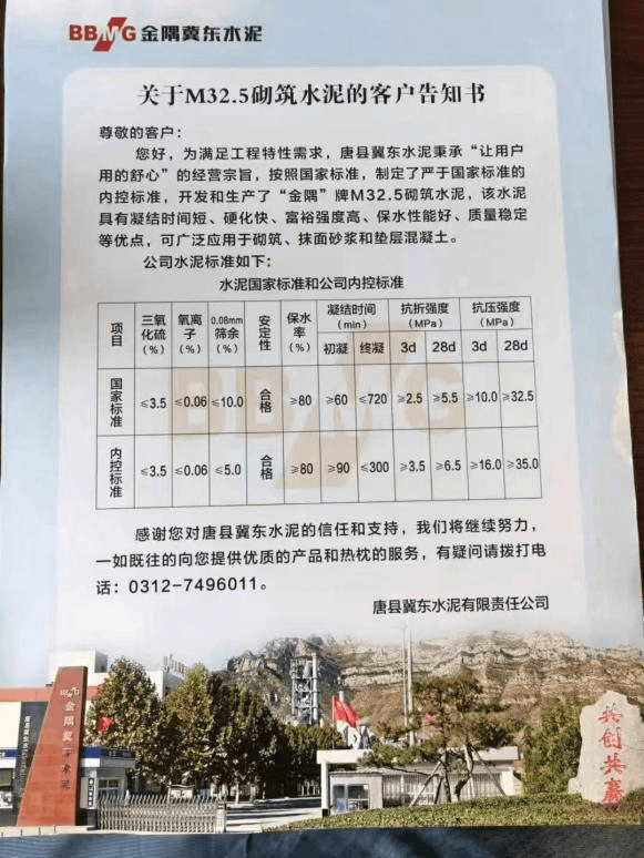 日前,唐縣冀東水泥有限責(zé)任公司通知客戶,為滿足工程特性需要,唐縣冀東秉承“讓用戶用的舒心“的經(jīng)營(yíng)宗旨,按照國(guó)家標(biāo)準(zhǔn),制定于嚴(yán)于國(guó)家標(biāo)準(zhǔn)的內(nèi)控標(biāo)準(zhǔn),開發(fā)和生產(chǎn)了”金隅“牌M32.5砌筑水泥,該水泥具有凝結(jié)時(shí)間短、硬化快、富裕強(qiáng)度高、保水性能好、質(zhì)量穩(wěn)定等優(yōu)點(diǎn),可廣泛應(yīng)用于砌筑、抹面砂漿和墊層混凝土。