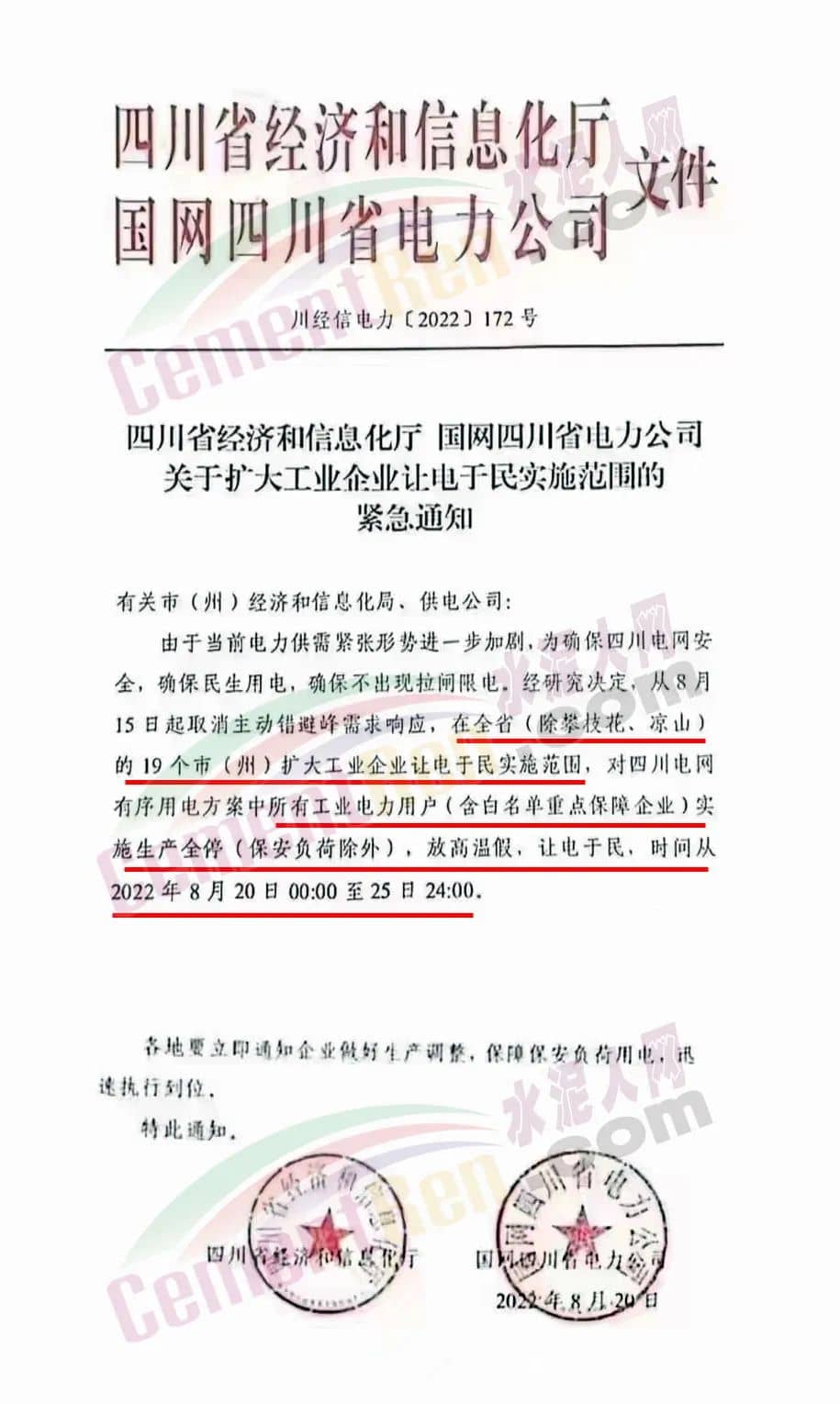 此前,四川利森建材、四川峨眉山西南水泥曾發(fā)《緊急告知函》通知于8月15日0:00起全面停產(chǎn),無法保障客戶正常水泥使用需求。另有包括海螺水泥在內(nèi)的多家企業(yè)通知限量、限時供應(yīng)水泥。水泥企業(yè)限電停產(chǎn),限量限時供應(yīng),疊加長江“汛期反枯”波及航運(yùn)航道大幅收窄貨船減載,水泥供應(yīng)大幅減少。