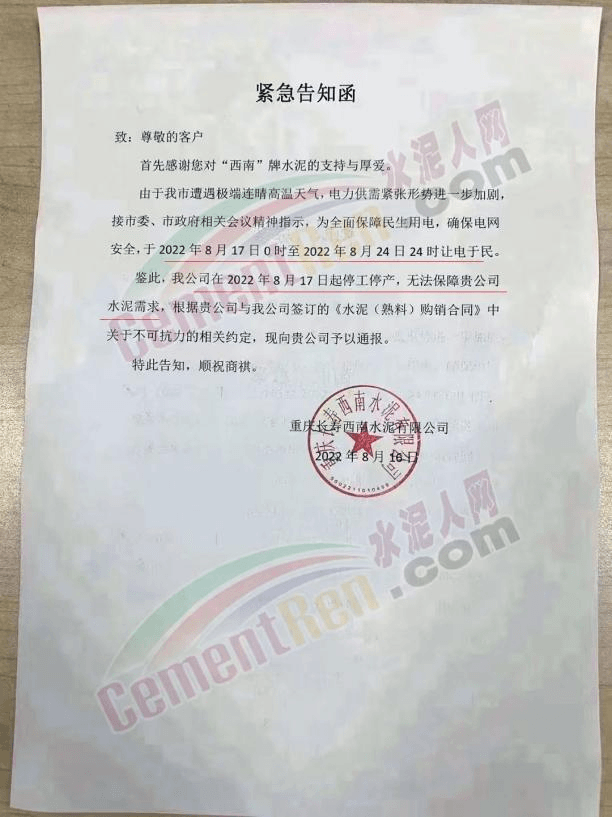 重慶長壽西南水泥8月17日起停工停產(chǎn),無法保障水泥供應(yīng)。
