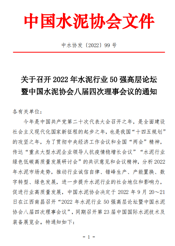 今年是中國共產(chǎn)黨第二十次代表大會召開之年,是全面建設(shè)社會主義現(xiàn)代化國家新征程的起步之年,也是我國“十四五規(guī)劃”的攻堅(jiān)之年,為了貫徹中央經(jīng)濟(jì)工作會議和全國“兩會”精神,傳達(dá)“重點(diǎn)大型水泥企業(yè)領(lǐng)導(dǎo)人抗疫情穩(wěn)增長會議”“水泥行業(yè)綠色低碳高質(zhì)量發(fā)展研討會”的共識意見和會議精神,分析2022年水泥市場走勢,推動(dòng)行業(yè)誠信自律、錯(cuò)峰生產(chǎn)、產(chǎn)能置換、數(shù)字轉(zhuǎn)型、綠色發(fā)展,進(jìn)一步提升水泥行業(yè)的社會地位和影響力,促進(jìn)行業(yè)高質(zhì)量發(fā)展,中國水泥協(xié)會決定于2022年9月20~21日在江西省南昌市召開“2022年水泥行業(yè)50強(qiáng)高層論壇暨中國水泥協(xié)會八屆四次理事會議”,同期召開第23屆中國國際水泥技術(shù)及裝備展覽會。