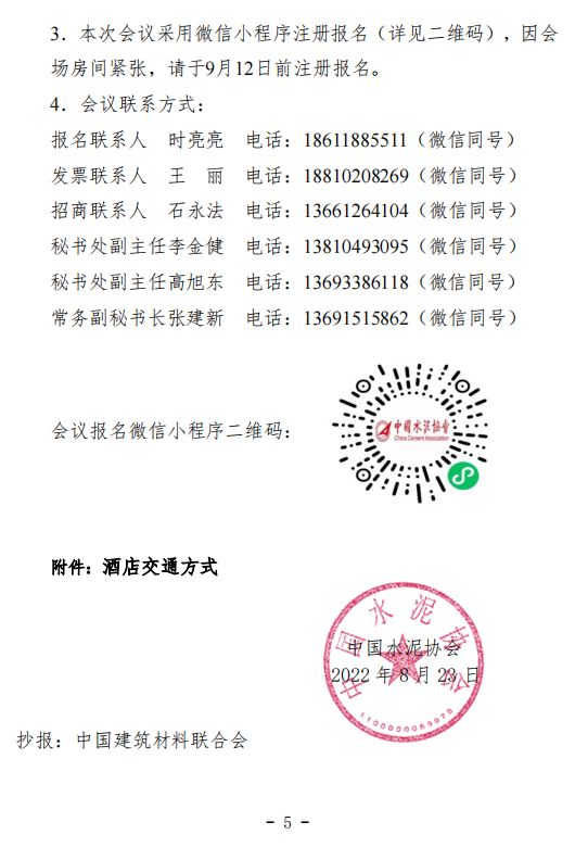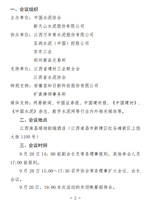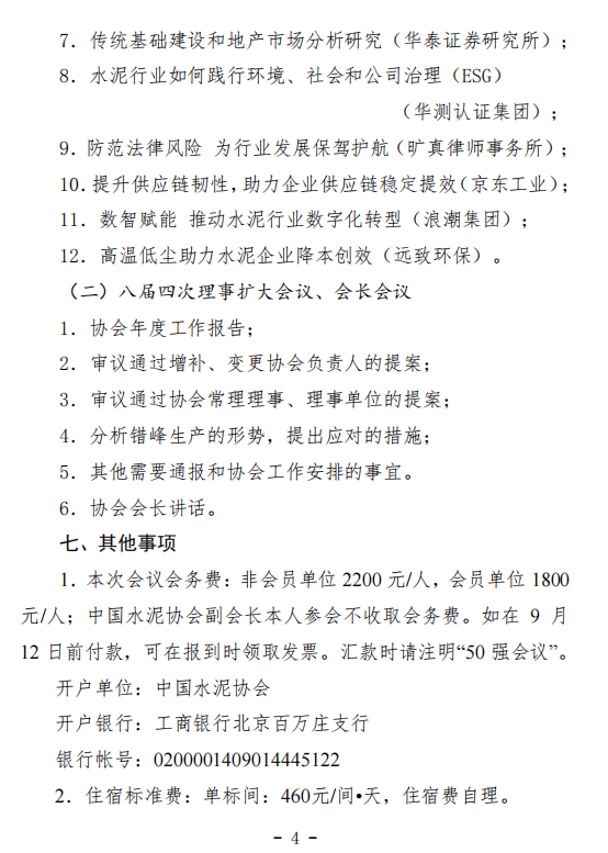 1.本次會議會務(wù)費(fèi):非會員單位2200元/人,會員單位1800元/人;中國水泥協(xié)會副會長本人參會不收取會務(wù)費(fèi)。如在9月12日前付款,可在報(bào)到時(shí)領(lǐng)取發(fā)票。匯款時(shí)請注明“50強(qiáng)會議”。
