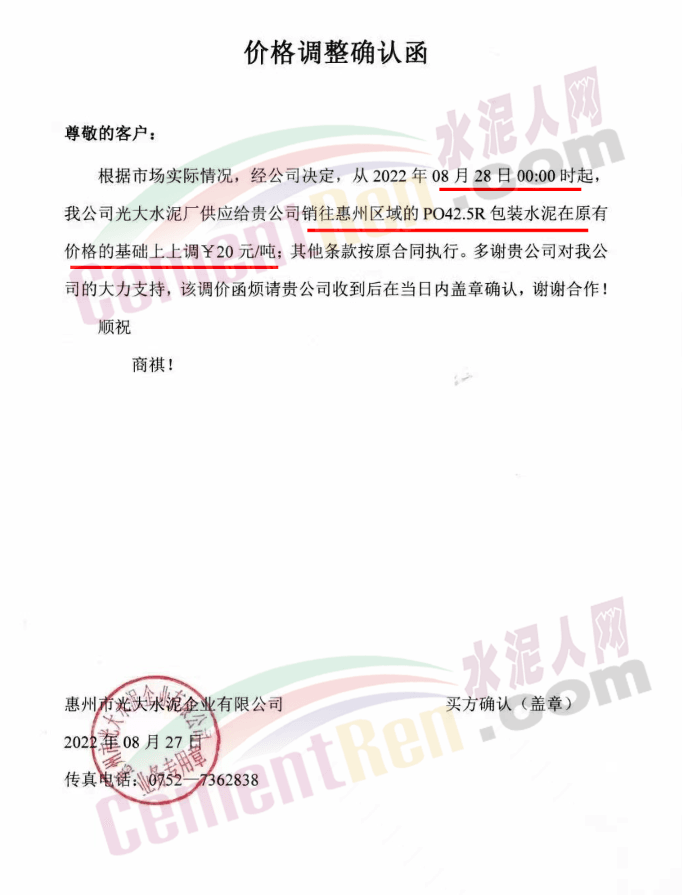 水泥人網(wǎng)消息:惠州光大水泥通知自8月28日0時(shí)起銷往廣東惠州區(qū)域的P.O42.5包裝水泥上調(diào)20元/噸。