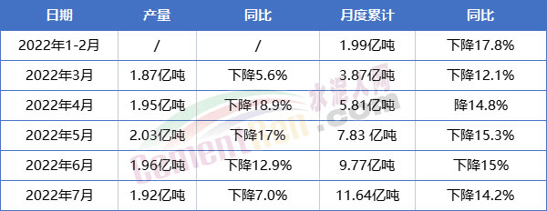 攪拌站都沒干活,水泥行業(yè)就更不用說了。統(tǒng)計(jì)數(shù)據(jù)顯示,2022年1-7月,全國累計(jì)水泥產(chǎn)量11.64億噸,同比下降14.2%;全國固定資產(chǎn)投資(不含農(nóng)戶)319812億元,同比增長5.7%;全國房地產(chǎn)開發(fā)投資79462億元,同比下降6.4%。