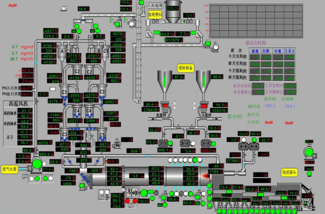 最近的一條標(biāo)準(zhǔn)設(shè)計的5000t/d生產(chǎn)線,在兩年前就全部打開三次風(fēng)管閥門運行的基礎(chǔ)上,采用了“節(jié)能型低氮燃燒器”,把噴煤管定位在中心線以上進行運行,再次取得了降低熱耗,提高產(chǎn)量,提高熟料強度,降低高溫風(fēng)機轉(zhuǎn)速和電流的明顯效果。并且在產(chǎn)量達到7000t/d的工況下,一級旋風(fēng)筒出口的壓力只有5000pa。創(chuàng)造了同類型同規(guī)格預(yù)熱器的最低壓力和最低的熱耗。該生產(chǎn)線的運行界面如下: