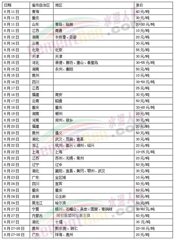據(jù)水泥人網(wǎng)不完全統(tǒng)計(jì)7月中旬至8月初江蘇、浙江、上海、安徽、河南、山東、河北、福建、遼寧、吉林、陜西、重慶、四川、貴州、廣西等20多個區(qū)域水泥價(jià)格通知上調(diào)。進(jìn)入8月中旬,發(fā)布漲價(jià)函的區(qū)域進(jìn)一步擴(kuò)大至青海、寧夏、內(nèi)蒙、黑龍江、湖北、北京、天津等30多個區(qū)域。