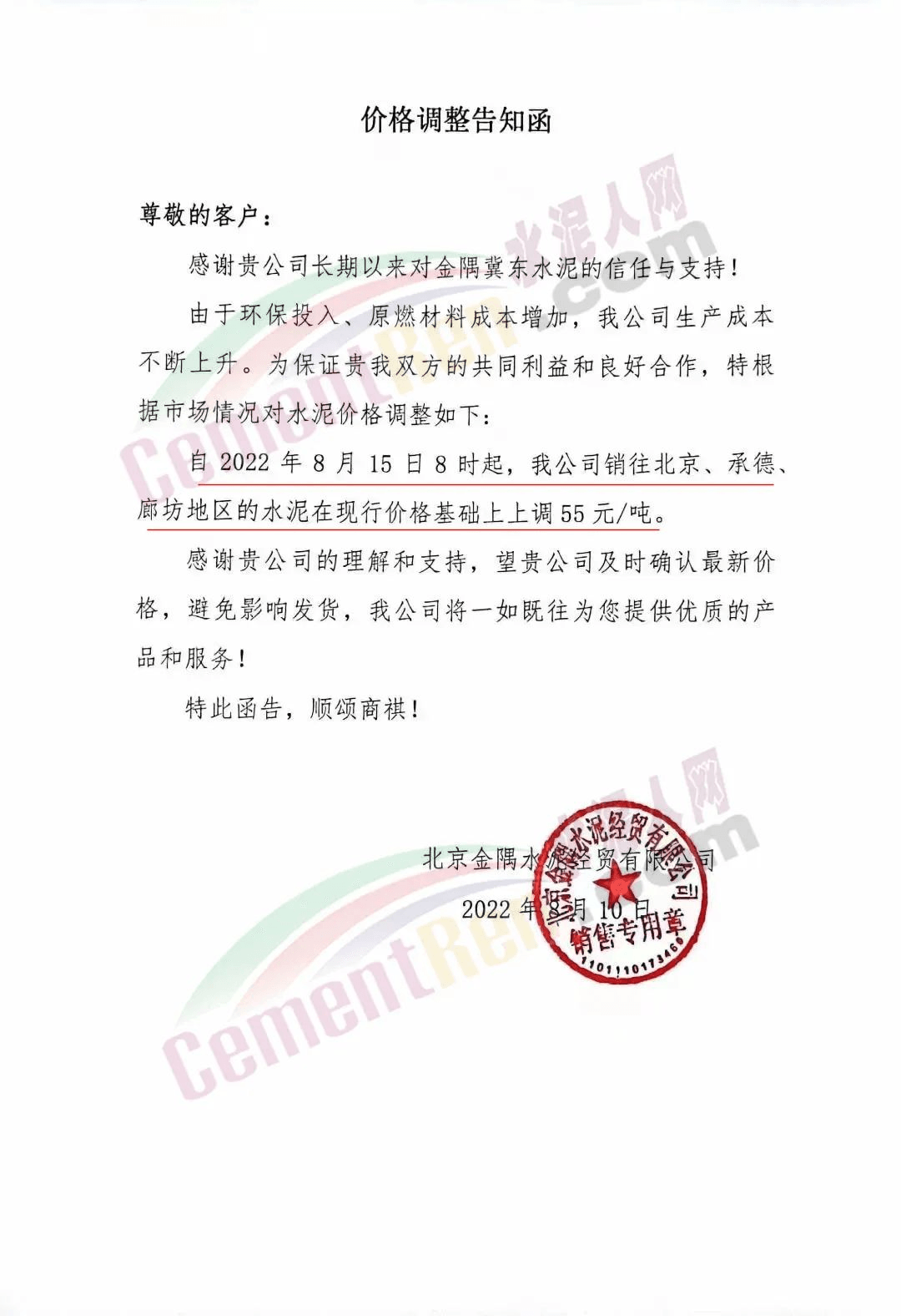 水泥人網(wǎng)通訊員消息:日前北京金隅經(jīng)貿(mào)公司通知,由于環(huán)保投入、原燃材料成本增加,公司生產(chǎn)成本不斷上升。自2022年9月1日8時起,銷往承德地區(qū)的水泥在現(xiàn)行價格基礎上上調(diào)130元/噸。