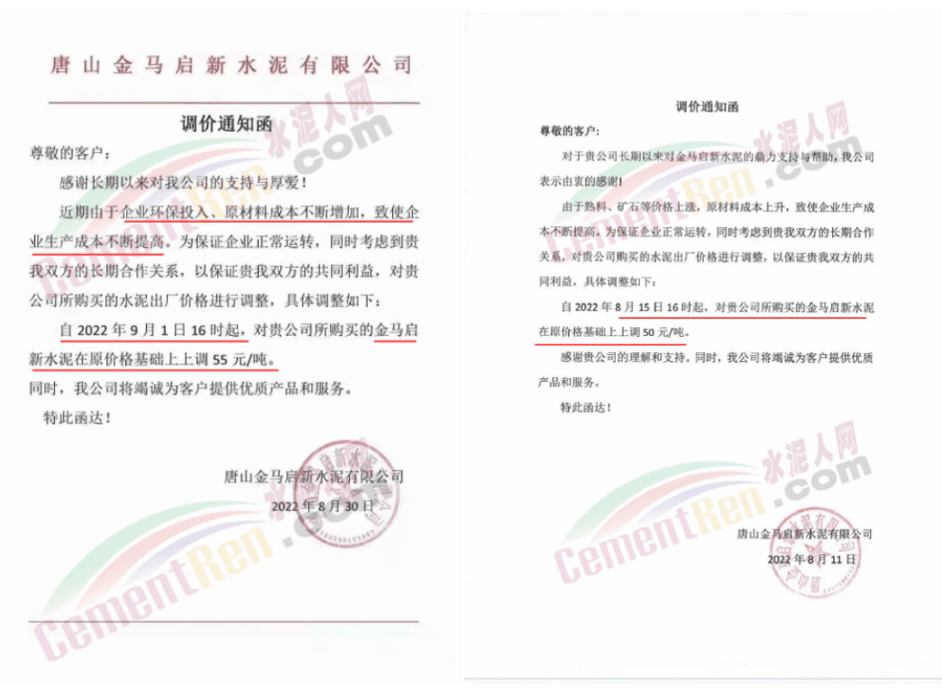 唐山金馬啟新水泥有限公司分別于8月15日、9月1日上調(diào)50元/噸、55元/噸,累計上調(diào)105元/噸。