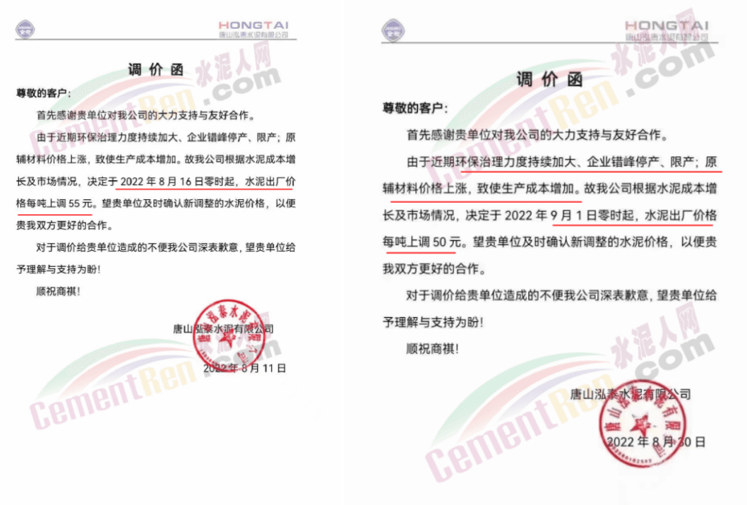 唐山泓泰水泥有限公司,分別于8月16日,9月1日上調(diào)水泥價格55元/噸、50元/噸,累計上調(diào)105元/噸。