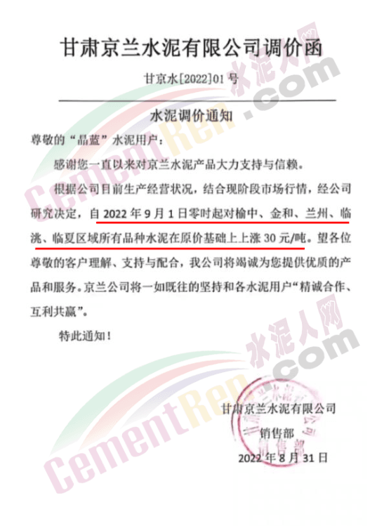 京蘭水泥通知,自2022年9月1日零時起對榆中、金和、蘭州、臨洮、臨夏區(qū)域所有品種水泥在原價基礎上上漲30元/噸。
