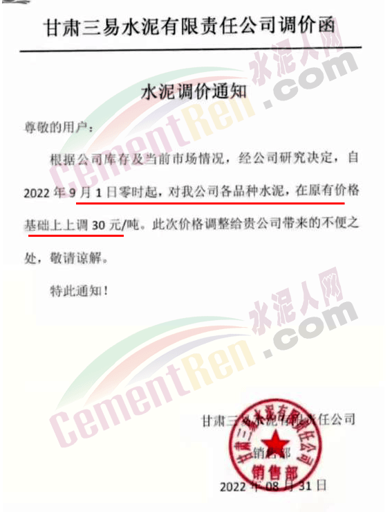 甘肅三易水泥通知,自9月1日零時起,對公司各品種水泥上調(diào)30元/噸。