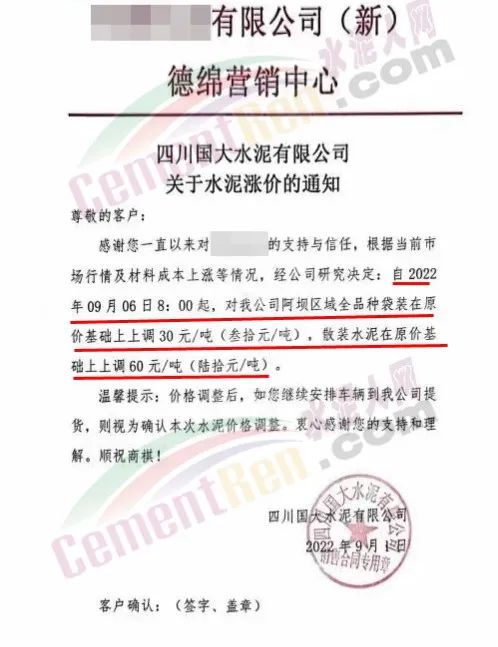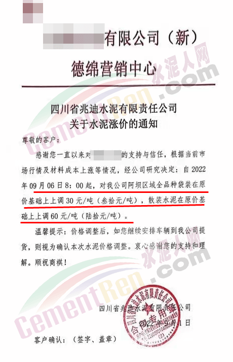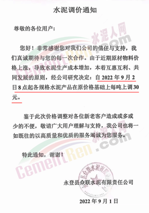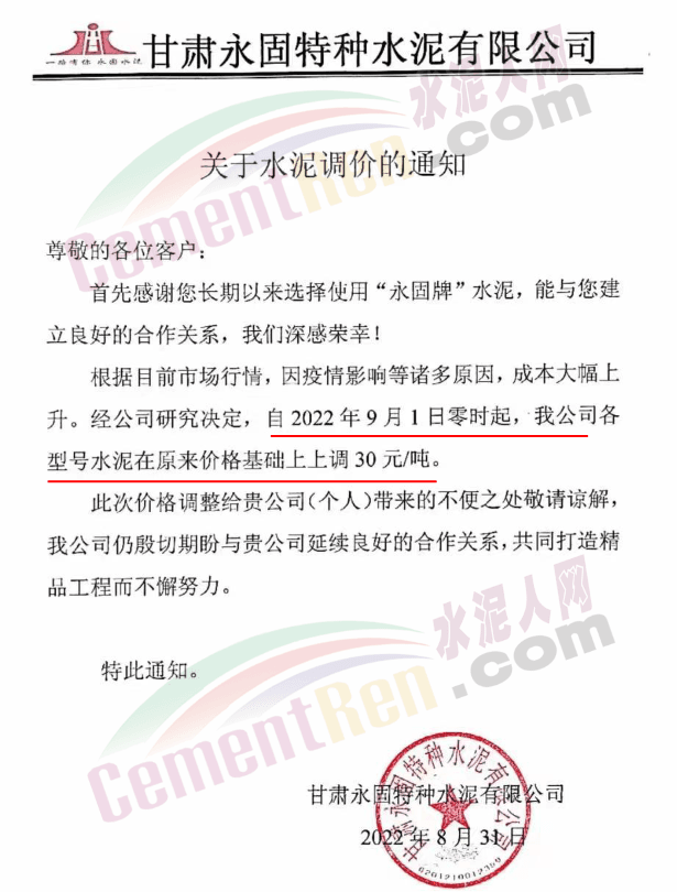 甘肅永固特種水泥有限公司通知因疫情影響等諸多原因,成本大幅上升。經(jīng)公司研究決定,自9月1日零時起,各型號水泥在原價基礎上上調(diào)30元/噸。
