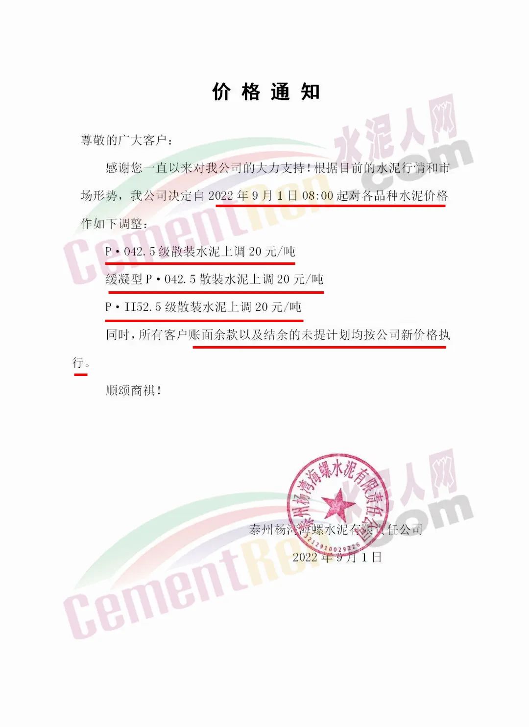 江蘇上峰水泥通知,8月30日0時起,各品種各規(guī)格水泥上調(diào)20元/噸,且所有客戶賬面余款以及結(jié)余的未提計劃均按公司新價格執(zhí)行。