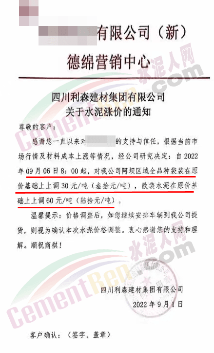 與此同時,四川亞東水泥、四川蘭豐水泥等水泥企業(yè)通知因原材料價格上漲及環(huán)保成本增加,自2022年9月1日早上8時起,大成都區(qū)域所有標號袋裝水泥在原售價基礎上上調(diào)50元/噸,所有標號散裝水泥在原售價基礎上調(diào)60元/噸。