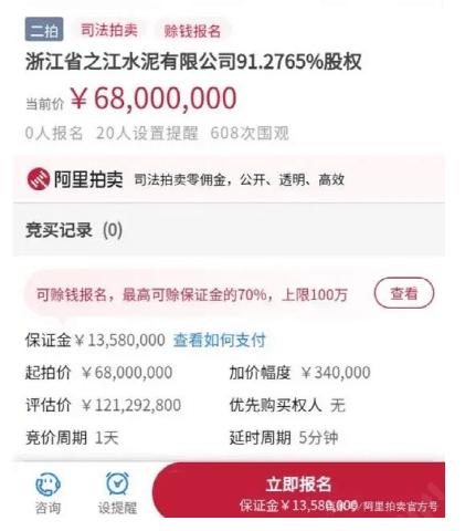 2021年9月24日在阿里拍賣平臺上,由浙江省金華市中級人民法院處置的杭州黑社會組織“骨干”王觀成名下浙江省之江水泥有限公司91.2765%股份公開拍賣。記者從拍賣平臺獲悉,王觀成所涉案件位列近年浙江省掃黑除惡案例榜首,他和首要分子虞關榮、戴國松一審均被判無期徒刑,并處沒收個人全部財產。