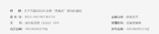 針對于2022年全國“質(zhì)量月”活動,總理作出重要批示。批示指出:質(zhì)量是立業(yè)之本、強國之基,事關(guān)民生福祉。各地區(qū)、各有關(guān)部門要認真貫徹黨中央、國務院決策部署,牢固樹立質(zhì)量第一意識,推動經(jīng)濟發(fā)展不斷提高質(zhì)量效益。要加強政策引導,深入推進全面質(zhì)量管理,優(yōu)化產(chǎn)業(yè)鏈供應鏈質(zhì)量管理。