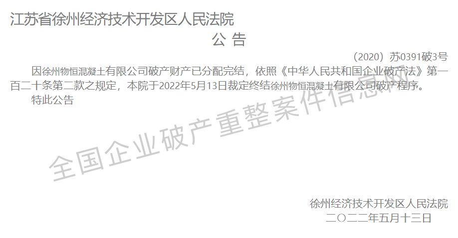 因徐州物恒混凝土有限公司破產(chǎn)財(cái)產(chǎn)已分配完結(jié),依照《中華人民共和國企業(yè)破產(chǎn)法》第一百二十條第二款之規(guī)定,江蘇省徐州經(jīng)濟(jì)技術(shù)開發(fā)區(qū)人民法院于2022年5月13日裁定終結(jié)徐州物恒混凝土有限公司破產(chǎn)程序。