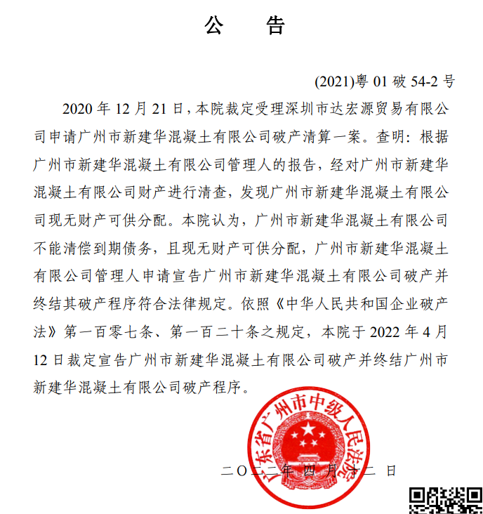2022年4月12日廣東省廣州市中級(jí)人民法院認(rèn)為,廣州市新建華混凝土有限公司不能清償?shù)狡趥鶆?wù),且現(xiàn)無財(cái)產(chǎn)可供分配,廣州市新建華混凝土有限公司管理人申請宣告廣州市新建華混凝土有限公司破產(chǎn)并終結(jié)其破產(chǎn)程序符合法律規(guī)定。