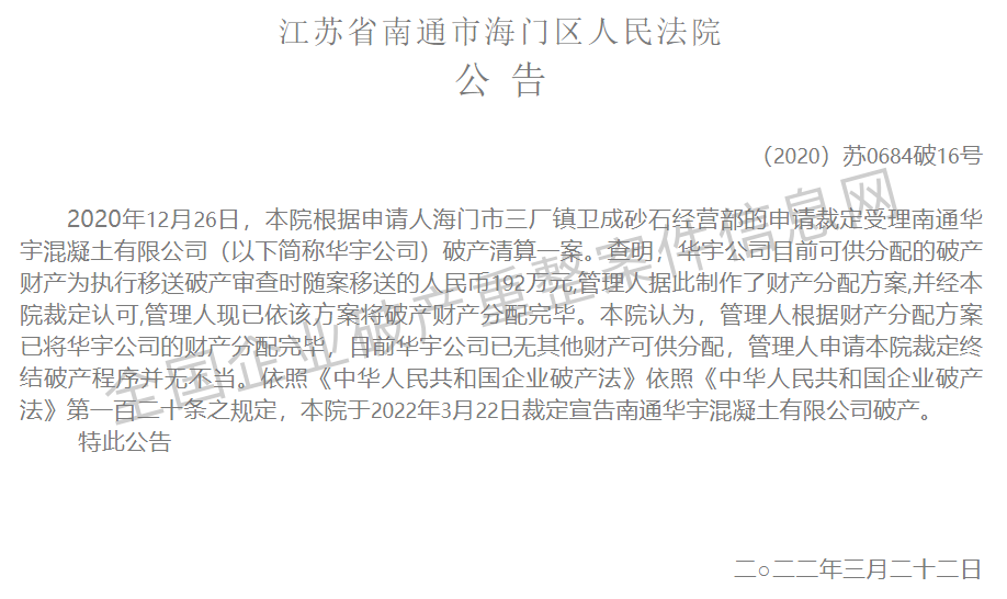 江蘇省南通市海門區(qū)人民法院于2022年3月22日裁定宣告南通華宇混凝土有限公司破產(chǎn)。