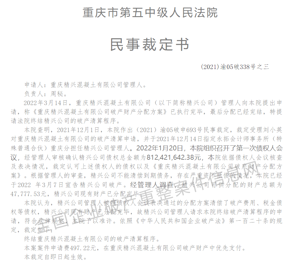 2022年3月14日,重慶精興混凝土有限公司管理人向重慶市第五中級(jí)人民法院提出申請,稱《重慶精興混凝土有限公司破產(chǎn)財(cái)產(chǎn)分配方案》已執(zhí)行完畢,最后分配已經(jīng)完結(jié),特提請法院終結(jié)精興公司的破產(chǎn)清算程序。