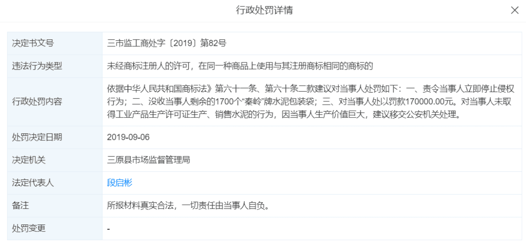 相關(guān)新聞輿情顯示,2020年9月陜西省咸陽市三原縣公安局經(jīng)偵大隊聯(lián)合安樂派出所在三原縣安樂鎮(zhèn)三原恒安建材公司現(xiàn)場查扣已裝車的 假冒“秦嶺”牌水泥3車30余噸,“秦嶺”牌水泥包裝袋2萬余個及相關(guān)賬務(wù)資料等。對涉案嫌疑人段某(男,54歲,三原縣渠岸鎮(zhèn)人,系該公司法定代表人) 采取刑事強制措施。